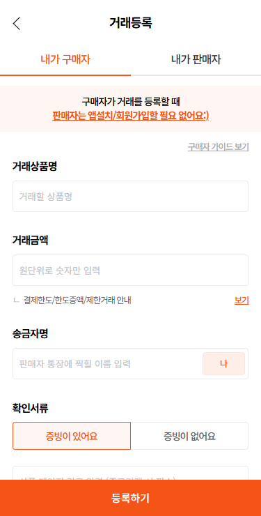 거래 상품명, 금액, 판매자 휴대폰번호, 증빙등록으로 뚝딱 거래등록!